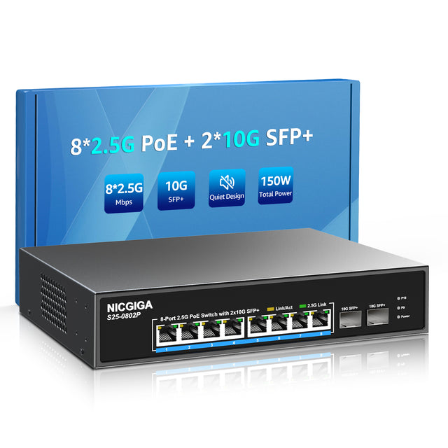 8 Port 2.5G PoE Switch Unmanaged with 8 Port 2.5Gb Base-T PoE+@130W + 2 x 10G SFP+ Uplink, NICGIGA 10 Port 2.5Gbe IEEE802.3af/at Power Over Ethernet Switch, Support WiFi6 AP, NAS, 4K PoE Camera NVR. is backordered and will ship as soon as it is back in stock.