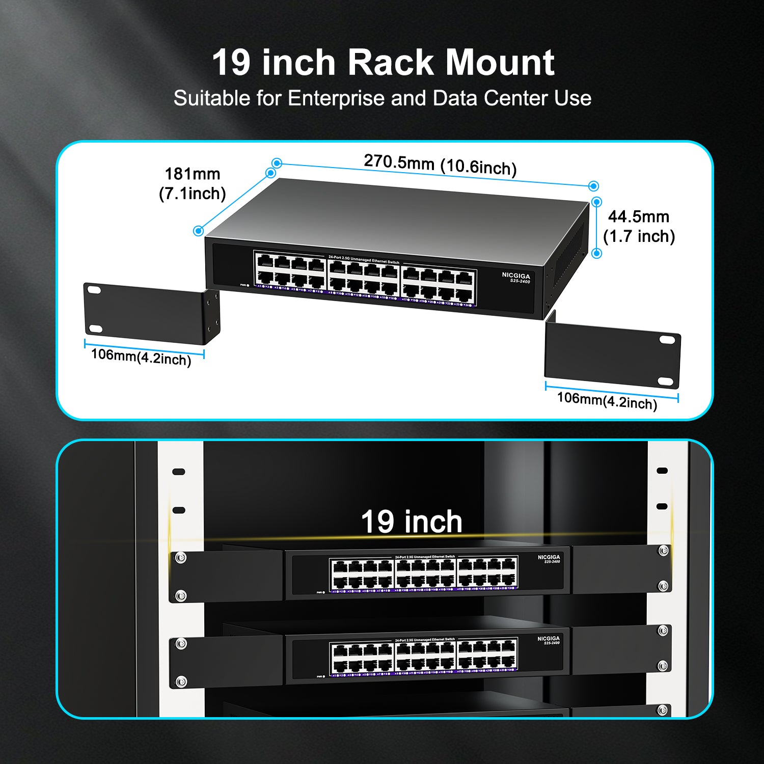 24 Port 2.5Gb Ethernet Switch Unmanaged, NICGIGA 24 Port 2.5G Network Switch, Plug & Play, Desktop or 19-inch Rack Mount, Fanless Metal Design.