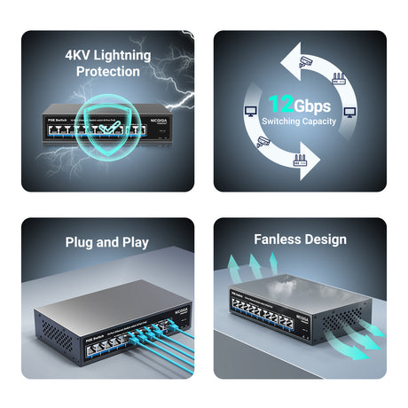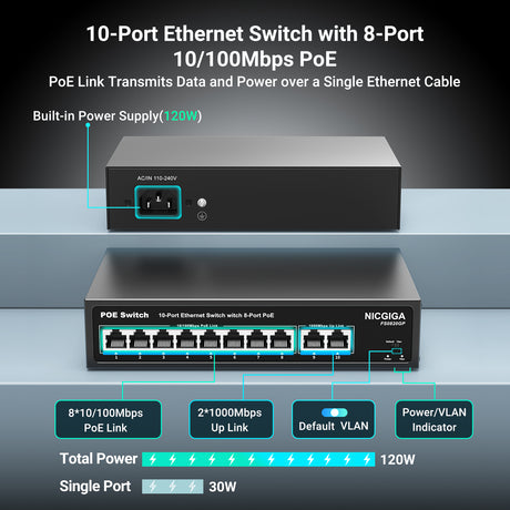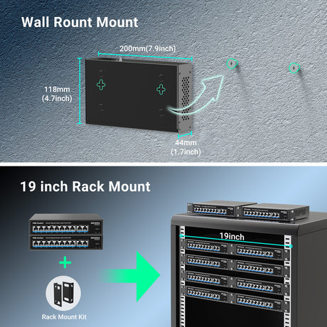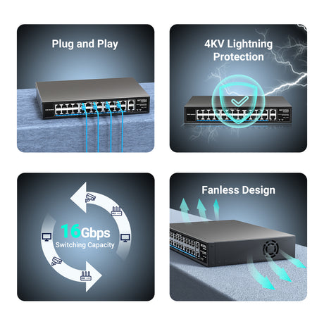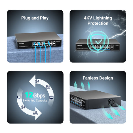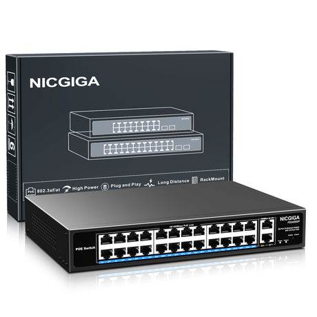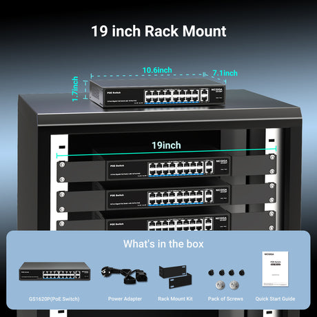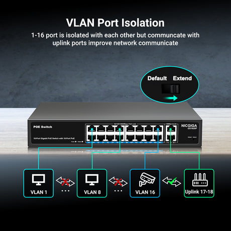 NICGIGA 18 Port PoE+@250W Switch - 16 Ports, 2 Gigabit Uplink, VLAN Mode, RackMount, Plug and Play
